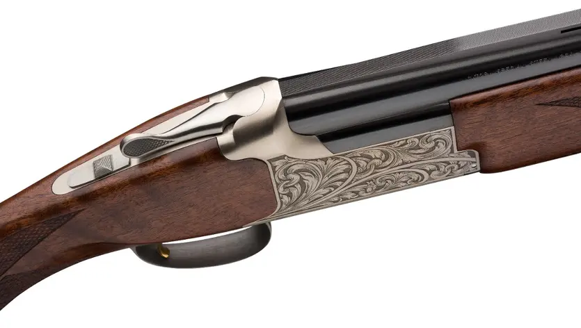 High-strength and lightweight alloy receiver with steel breech face and hinge pin, intricate engraving, polished blued barrels, oil finish grade III/IV walnut, extended black band Invector-Plus choke tubes.
