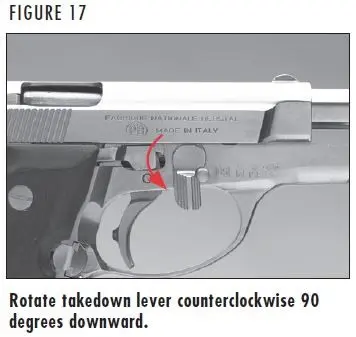 4. Depress the takedown lever stop (Figure 16). This is the small, button-like part that extends out of the frame just forward of the slide stop/release lever. The takedown lever stop passes through the frame of the pistol from the left to the right side. The takedown lever (on the right side) will not rotate unless the takedown lever stop is pushed in (on the left side), releasing the lever to rotate. With the button depressed, rotate the takedown lever on the right side of the frame counterclockwise 90 degrees downward (Figure 17).